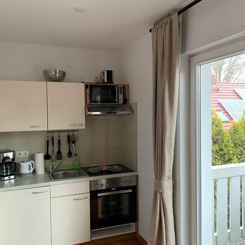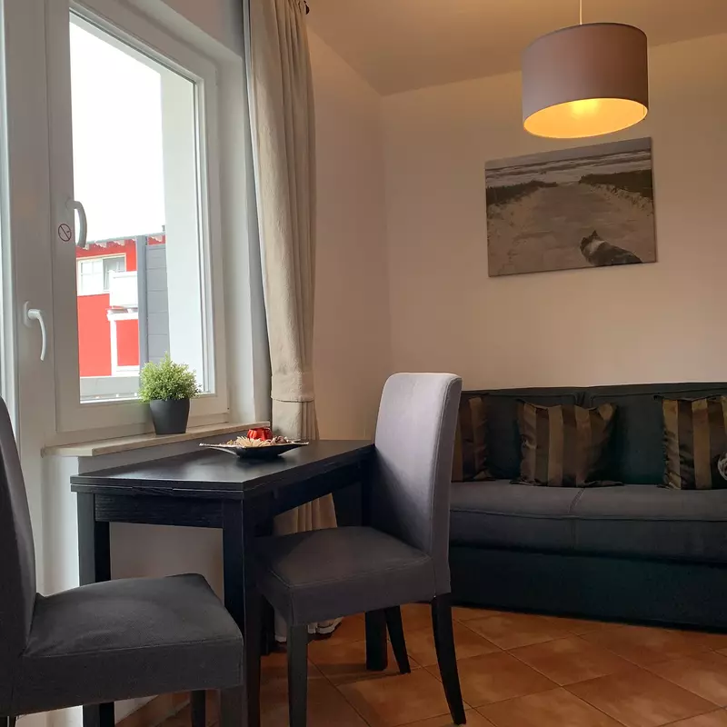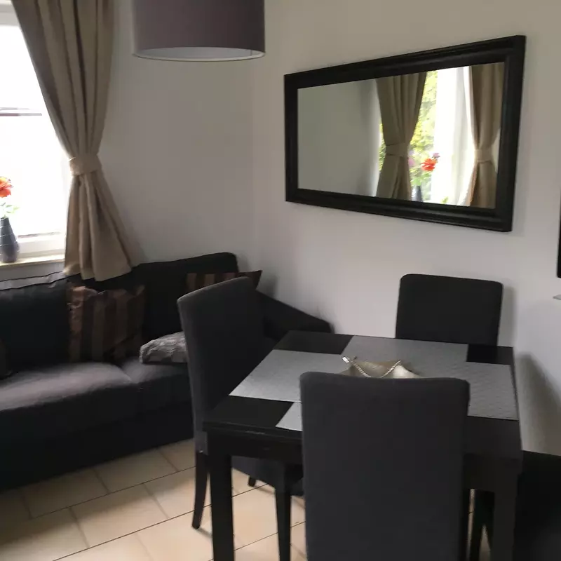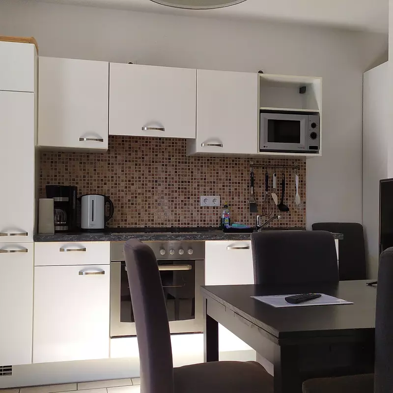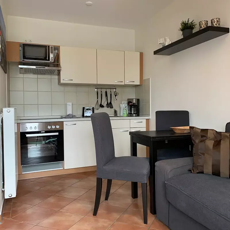 - Einem modernen Wohnzimmer mit Esstisch, Sitzecke mit einer gemütlichen Couch, einem Flachbildschirmfernseher und einer gut eingerichteten Küchenzeile mit: Toaster, Kaffeemaschine, Wasserkocher, Vier-Cerankochplatten mit Backofen, Kühlschrank mit Eisfach, Geschirrspüler ( nur in den Wohnungen im EG ) und diversen Küchenutensilien